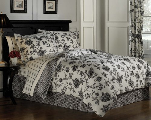 - Beautifully designed comforter set features French inspired black toile florals on one side and a black and off-white plaid pattern on the reverse.