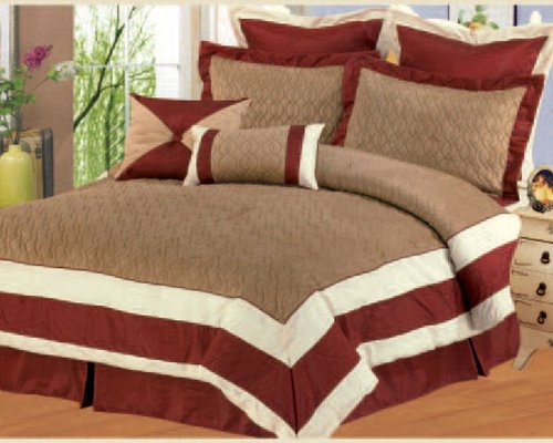 Queen Size, Faux MICROFIBER Bed in a Bag 8 pc. Comforter / Bedding Set / Bed Ensemble - BURGUNDY, TAN & BEIGE, Brand new Design and Beautiful colors combination. Package Contains: 1 Queen size Comforter 1 Bed Skirt 2 Pillow Shams 2 Euro Shams 1 Oblong Cushion 1 Square Cushion Material: Comforter Set Micro Faux, Filling 100% Polyester. Care Instructions: Machine wash cold water. Gentle Cycle, No Bleach.