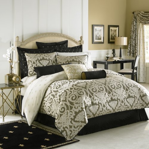 Redefine sophistication. Delicate fleur de lis accents beautifully complement a bold jacquard damask design in Waterford's Pomona bedding collection. Finished with cord detail and pops of rich black, this collection offers a fresh take on timeless luxury.