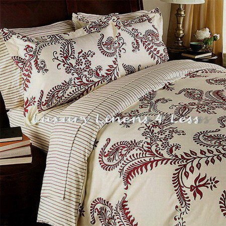 Luxury 310 Thread Count TROPICAL THEME FULL/QUEEN SIZE Red and Cream Bedding Duvet Cover Comforter Set BRAND NEW and FIRST QUALITY in original packaging. Gorgeous FLORAL Red Cream Bedding Duvet Cover Set. The ultimate in luxurious sleeping comfort. The special soft finish of this beautiful TROPICAL THEME Red Cream Bedding Set will provide years or comfort and lasting elegance. Duvet Cover and Pillow Shams feature a gorgeous RED FLORAL BRANCHES LEAVES pattern on an IVORY/CREAM background that gives a fabulous look. It is COMPLETELY REVERSIBLE to a RED and IVORY/CREAM ticking stripe. Generous Size 90" x 90" to fit thick mattress. It will give a New Look to your bedroom in minutes. More RED and CREAM Duvet Covers available. Take a look at our other items for more Red Cream Duvet and bedding with Red color. Black Tropical bedding, Branches Red bedding and Leaves Duvet bedding are very popular in bedroom decor this year.